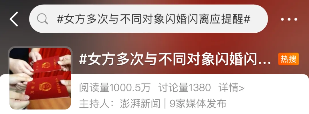 近日,福州市长乐区民政局透露,在办理结婚登记过程中,当发现女方曾多次与不同对象闪结闪离,或者发现双方当事人刚认识几天就申请登记时,该局要求婚姻登记窗口工作人员应予以提醒。相关话题随后冲上热搜引发讨论。