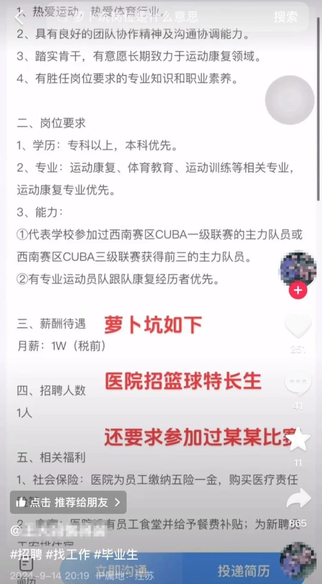 ▲网传某民营医院招篮球特长生岗位要求。图/网络视频截图