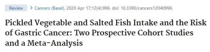还有研究显示,腌制后的食物和消化道癌症密切相关!2020 年发表在《癌症》上的一项荟萃分析研究发现,腌制蔬菜摄入量增加 40 克/天,胃癌风险增加 15% 。