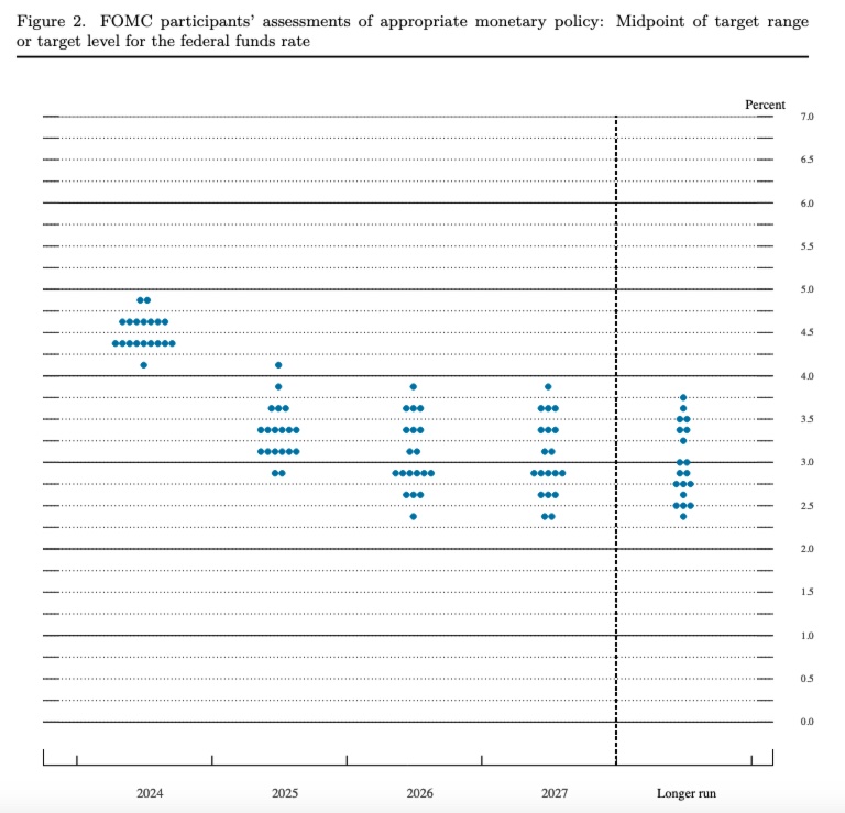 美联储点阵图显示,2024年底联邦基金利率预期中值为4.4%,此前为5.1%。在19位官员中,有2位认为在此次会议后,2024年不应再继续降息;有7位认为应再降息25个基点,有9位认为应再降息50个基点,有1位认为应再降息75个基点。