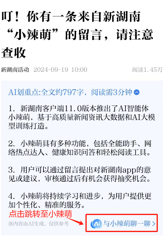 功能四:轻松阅读工具。小辣萌不仅可以帮用户总结新闻要点,还能实时统计新闻稿件的字数,预估阅读所需时间。并且,她还会自动提炼总结要点,以简洁明了的方式呈现在用户面前,着实贴心无比!