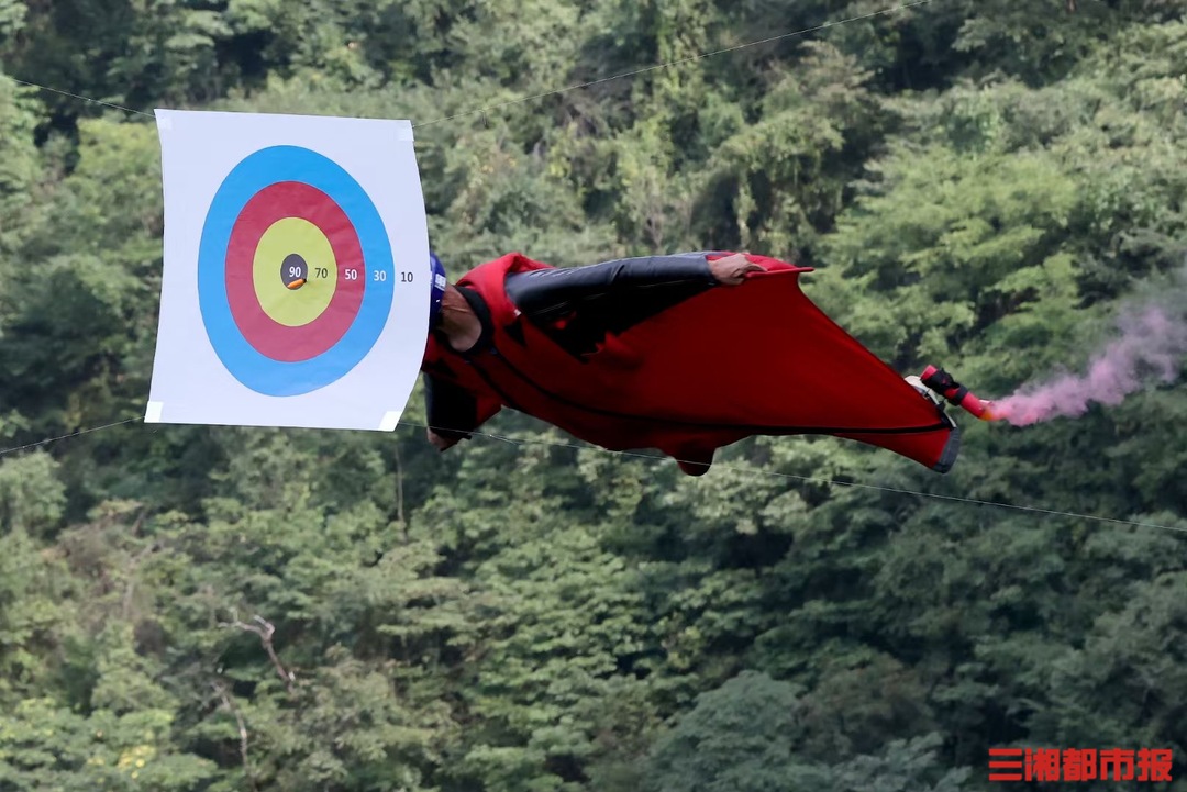 上午11时,8强选手登顶玉壶峰,依序跃出,以超200公里时速,化身人形箭矢穿过天门洞广场上空,冲向标靶,留下嗡鸣的气震声。