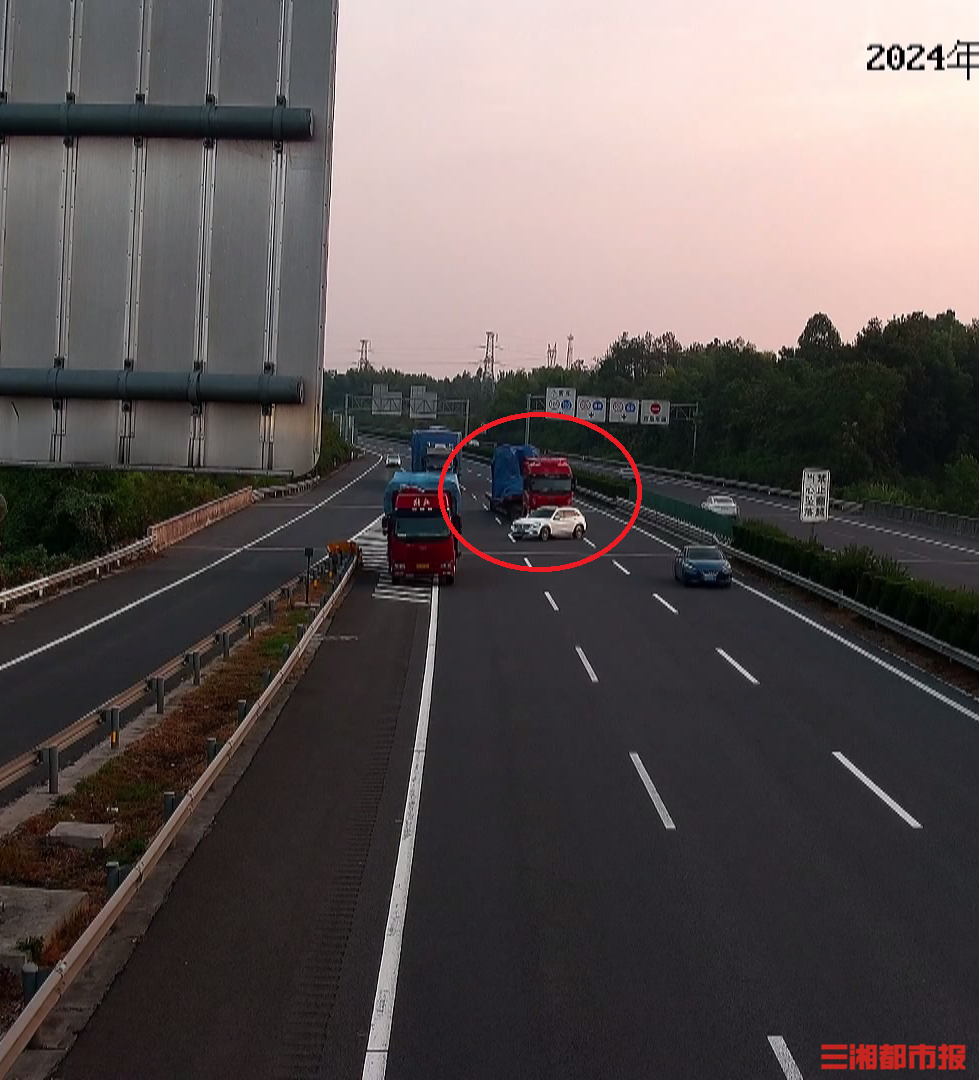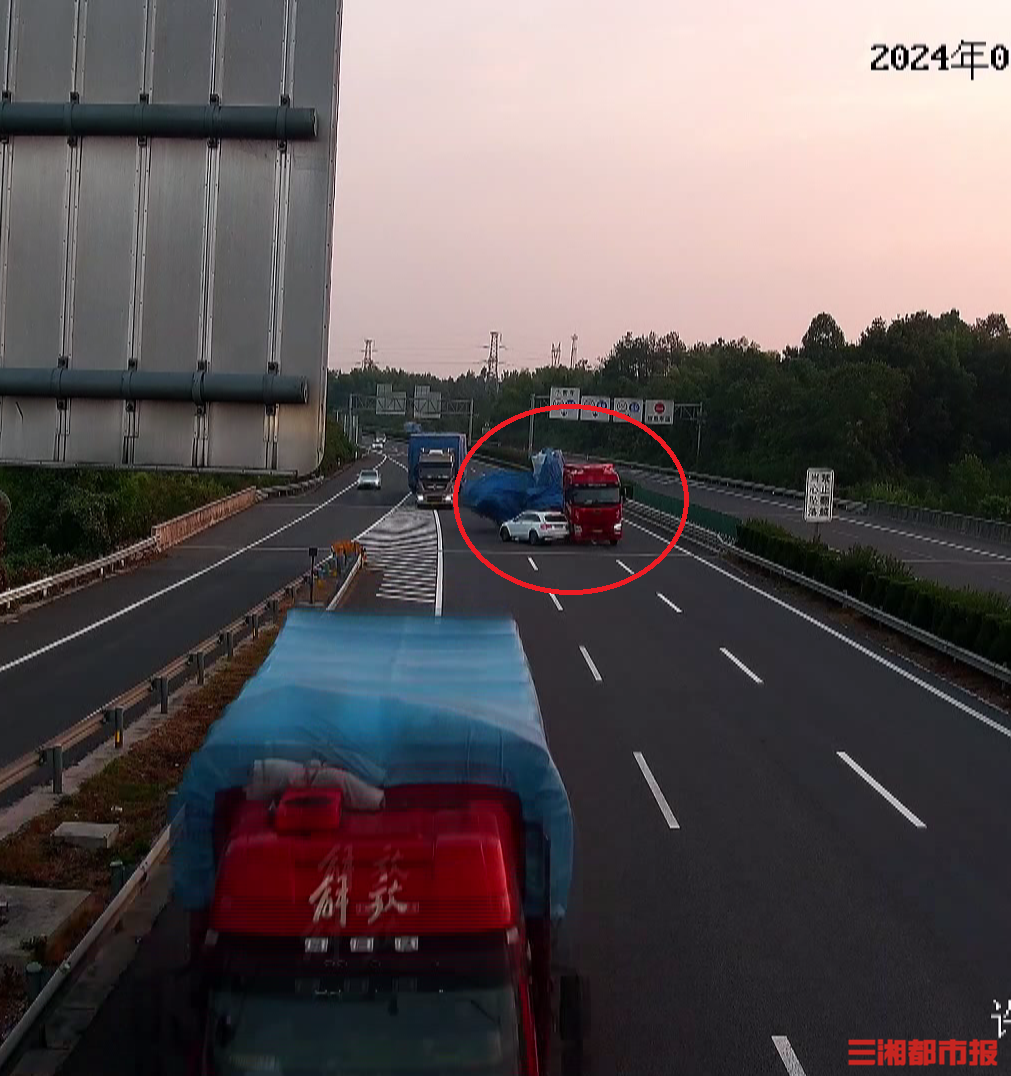 9月14日16时许,许广高速湖南岳阳段南往北方向岳阳东收费站出口匝道,一辆行驶在快车道的白色小车即将错过匝道口时,突然降速直接右转。公共场所视频显示,白色小车突然降速并开启转向灯往右变更车道,后方中间车道的大货车司机见状连闪大灯提醒白车,白车仍然继续横跨车道变道,直到发现外侧行车道也有车辆驶来才被迫停下。而此时中间车道上的大货车避让不及,径直撞上白车的右后方,货车上的货物随之也倾倒下来,洒落一地。