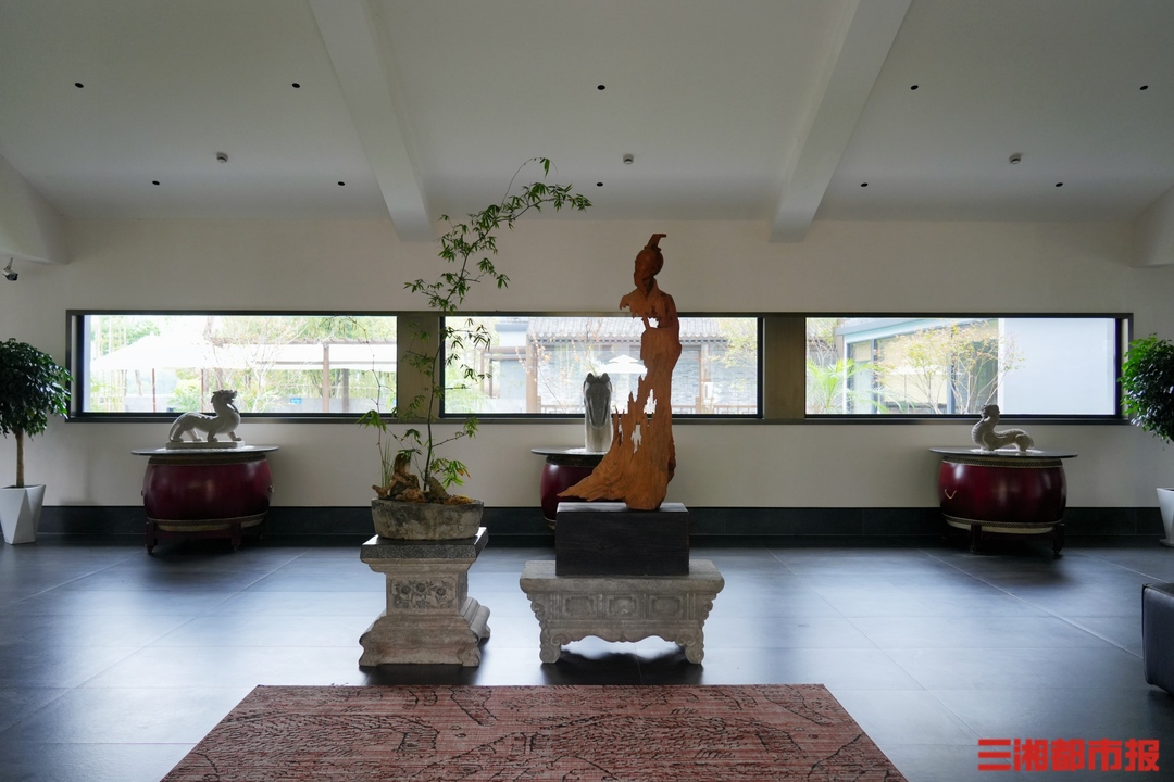 “民宿里的很多摆件塑像都是大有讲究的,基本都是来自于我们湖南,比如屈原、欧阳询、沈从文等等。”民宿主理人李文彦如数家珍地介绍起了店内的巧思,从形似岳麓书院的大门开始,民宿内的每一处都大有故事。