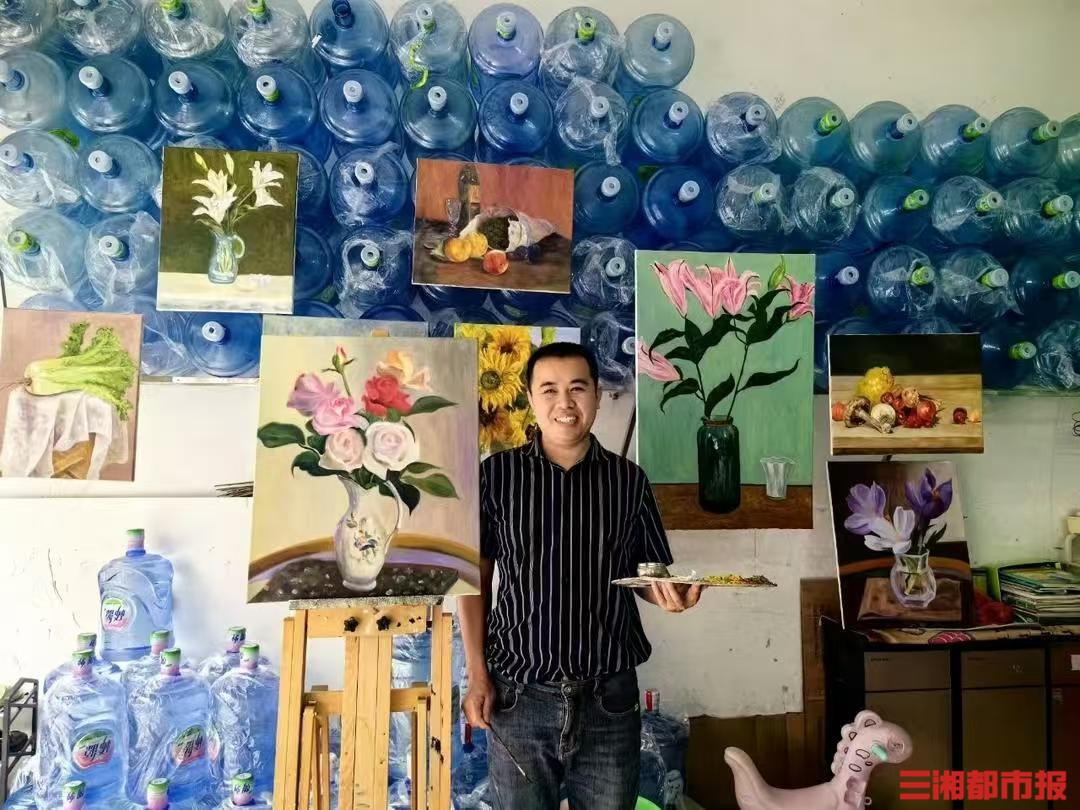 三湘都市报·新湖南客户端( 全媒体记者 田甜 通讯员 葛纪彤) 白日谋生,夜晚追梦,来自湖南郴州今年40岁的送水工刘如龙,用自己的方式诠释着热爱可抵万难。自学绘画,坚持18年,在不足3平方米的仓库内画出200多幅油画,“我想用绘画来表达自己的一些感悟和态度。”9月24日,刘如龙向记者讲述了热爱与坚持的故事。