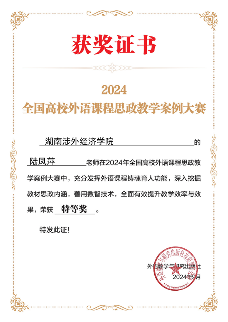新湖南客户端9月24日讯(通讯员 曹霞 刘雅楠 记者 胡旻)近日,在“2024年全国高校外语课程思政教学案例大赛”中,湖南涉外经济学院外国语与国际教育学院教师陆凤萍在1900多名参赛教师中脱颖而出,以卓越的教学设计和深刻的思政教育内涵,荣获本次大赛全国特等奖。