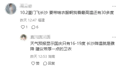 不少准备假期来长沙游玩的游客在线询问“穿衣攻略”,由于长沙气温变化迅猛,有网友建议“一年四季的衣服都带上”。虽然是玩笑,但多准备一件外套一定是不出错的选择。