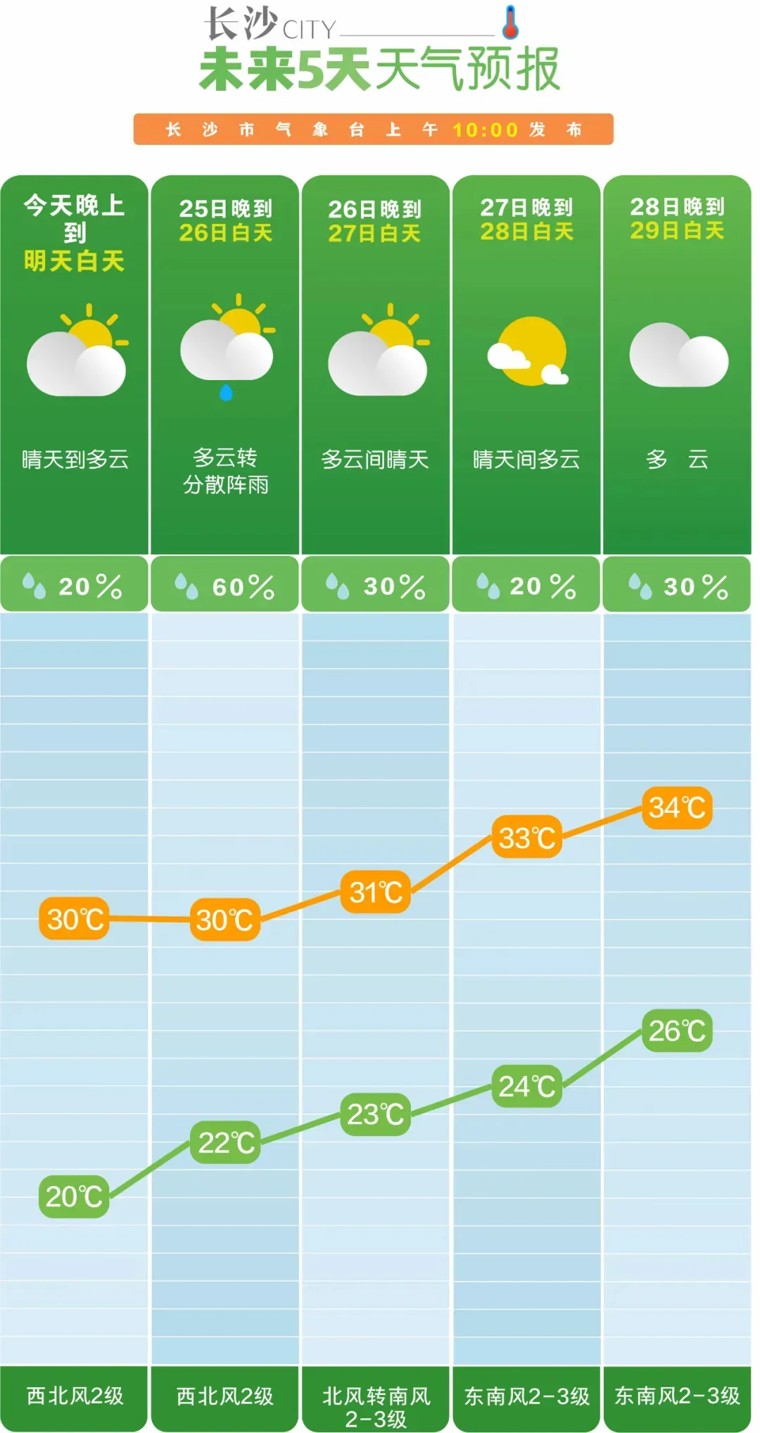 据长沙市气象台,未来一周雨日雨量偏少,气温有起伏,虽然最高温度来到了30℃以上,但昼夜温差8-10℃,大家要注意及时增添衣物,早晚注意着凉。