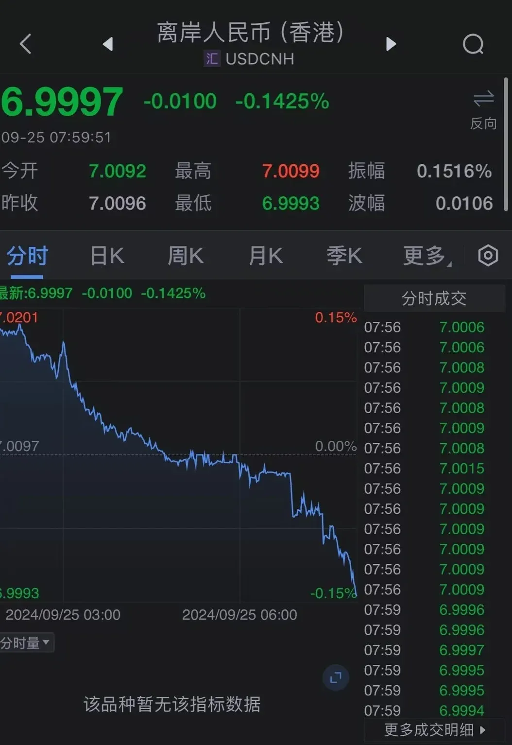 9月25日早盘,离岸人民币兑美元收复7.0关口,为去年5月以来首次,一度升至6.9952。