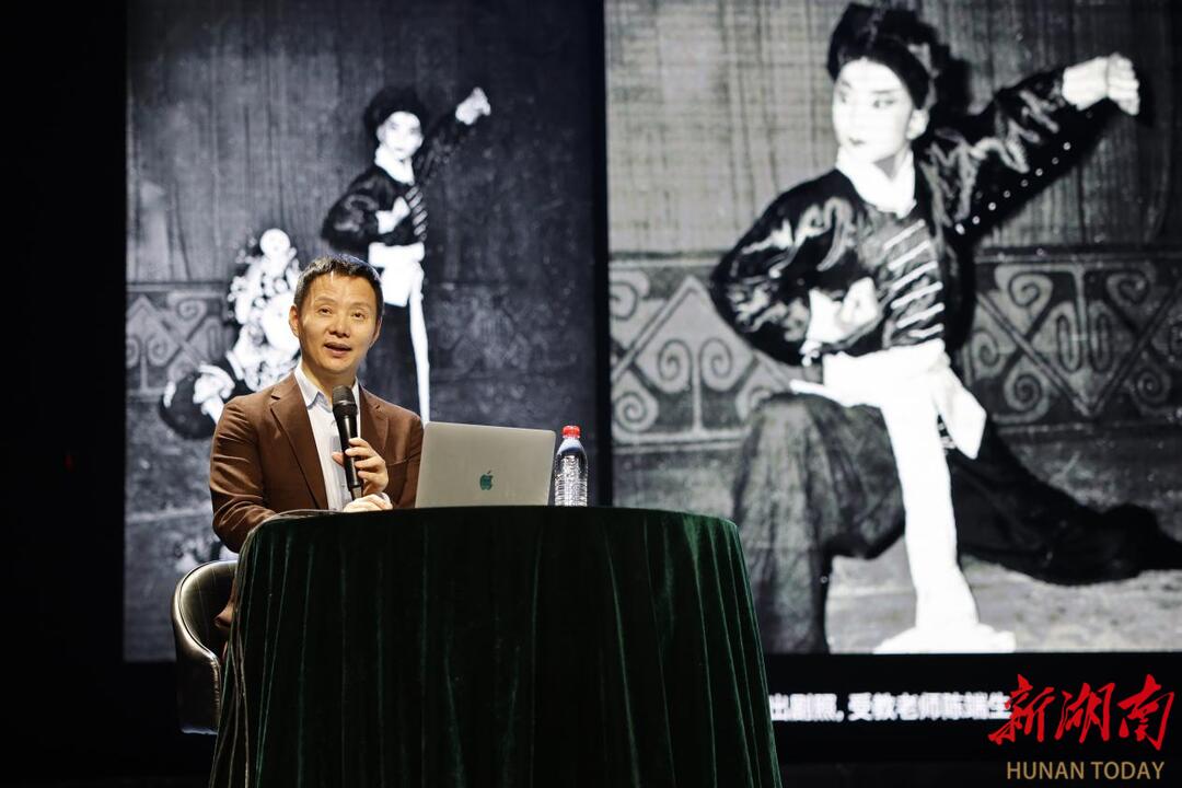 在随后的授课过程中,沈伟以自己“学艺”“从艺”“传艺”的亲身经历为线索,和大家共同探索“艺术视界”。他从一张张老照片、一个个老物件背后的故事切入,分享了自己年幼时在湖艺六载求学的美好回忆。沈伟强调,基础教育是非常重要的,学艺术尤其要打牢基本功。他分享了自己早年间在系统学习戏曲技艺的基础上,从身段的练习、动作的描画中,触类旁通地获得了舞蹈、美术等不同艺术门类的创作灵感,以至于开始主动尝试跨界融合,并且通过系统学习绘画、舞蹈、电影知识,坚持深入思考、不断突破创新,最终在国内国际多个艺术领域崭露头角、屡获大奖。