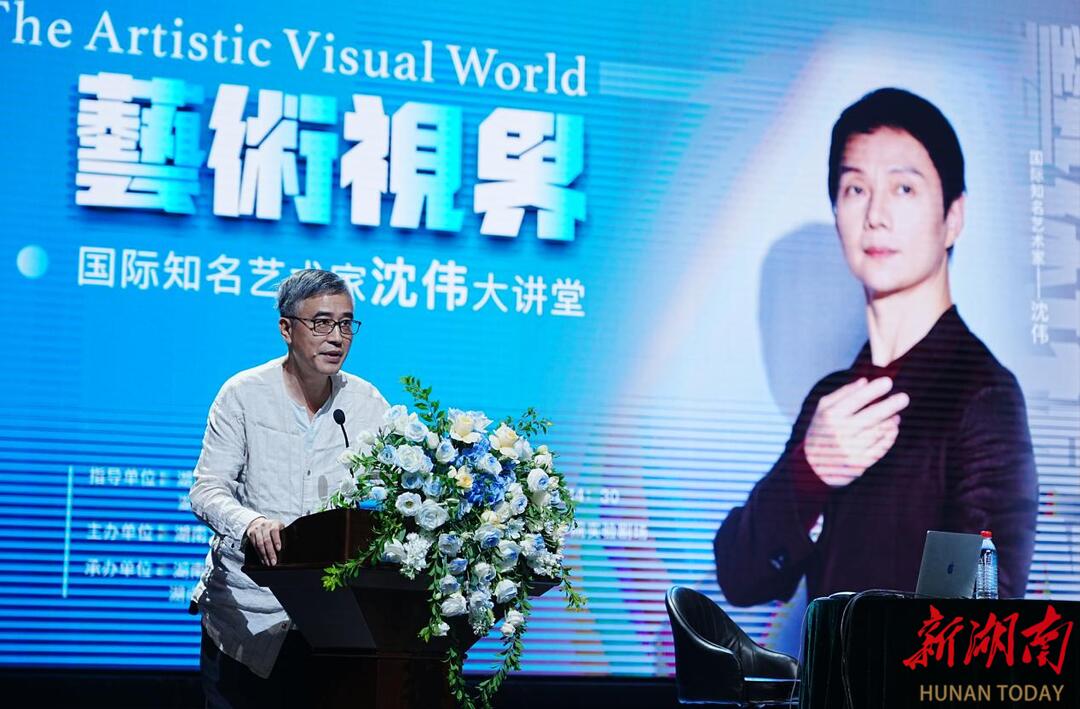 周邦春代表学校致辞。他表示,沈伟此番回校讲学,不仅彰显了对母校的深厚情谊,更是激励和鼓舞了湖艺人见贤思齐,勇于追求卓越、跨界融合、传承创新。希望广大师生珍惜这次难得的学习机会,从杰出校友的经历中汲取榜样力量、明确奋斗方向;也祝愿沈伟的艺术之路越走越宽广,为母校的艺术教育事业贡献更多智慧和力量。