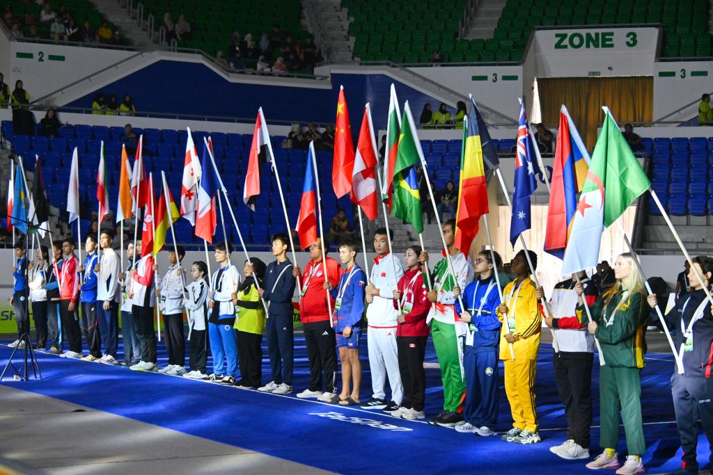 9月25日,各代表队旗手在开幕式上列队。当日,第九届世界青少年武术锦标赛在文莱开幕。新华社发(黄志平摄)