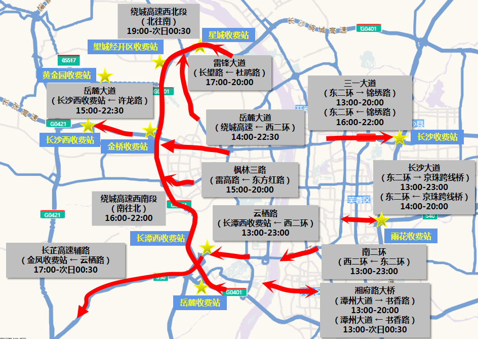 10月7日13时至20时为进城车流最大时段,13时云栖路、岳麓大道、三一大道、湘府路高架、云栖路等道路返程车流依次增加;20时除长沙大道以外,其他进出城通道交通恢复正常;23时全部恢复正常。