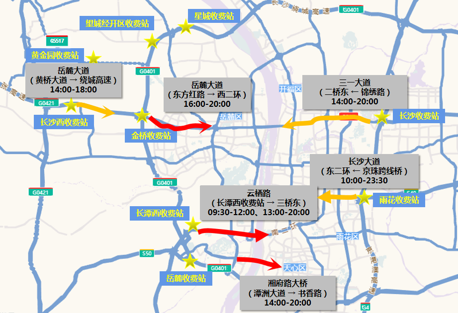 预计从9月30日13时开始,城区车流量逐渐增加,云栖路、岳麓大道、长沙大道、南二环、三一大道、湘府路高架等道路出城方向车流依次上升。18时至19时拥堵指数达到峰值,21时后除部分出城节点仍较为拥堵外,城区交通基本恢复正常,23时除绕城高速、湘府路大桥等道路出城方向以外,城区其他主要进出城通道交通基本恢复正常。另外,据天气预报,当天可能有小雨,降雨天气会导致拥堵指数上升10%—20%。