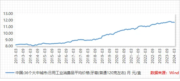Wind数据显示,国家发改委发布的36个大中城市普通120克左右牙膏的平均价格2013年1月31日8.16元/盒,2020年1月31日10.00元/盒,2024年3月31日达到11.68元/盒。