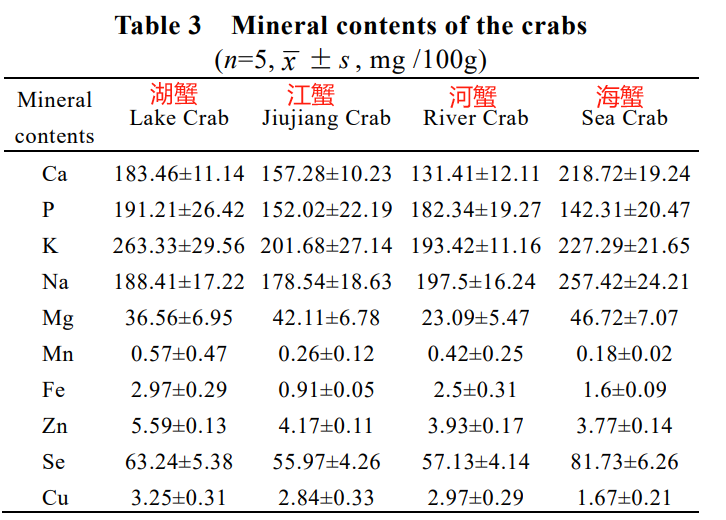 结果显示,这 4 种螃蟹蛋白质含量为 13.5%~17.7%,脂肪含量为 2.2%~2.7%。其中江蟹蛋白质含量最高;湖蟹的蛋白质含量较高而脂肪较低;海蟹的蛋白质含量较低,磷、钾、锰、铁、锌、铜含量较高;江蟹的锌含量最高。