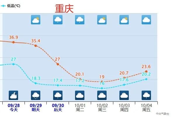 重点提醒计划前往重庆的小伙伴们,千万看好气温预报!今天重庆截至17时最高气温37.4℃,高温暑热;明天高温还将在线;不过10月2日,最高气温将降到19℃,过程降温幅度接近20℃。