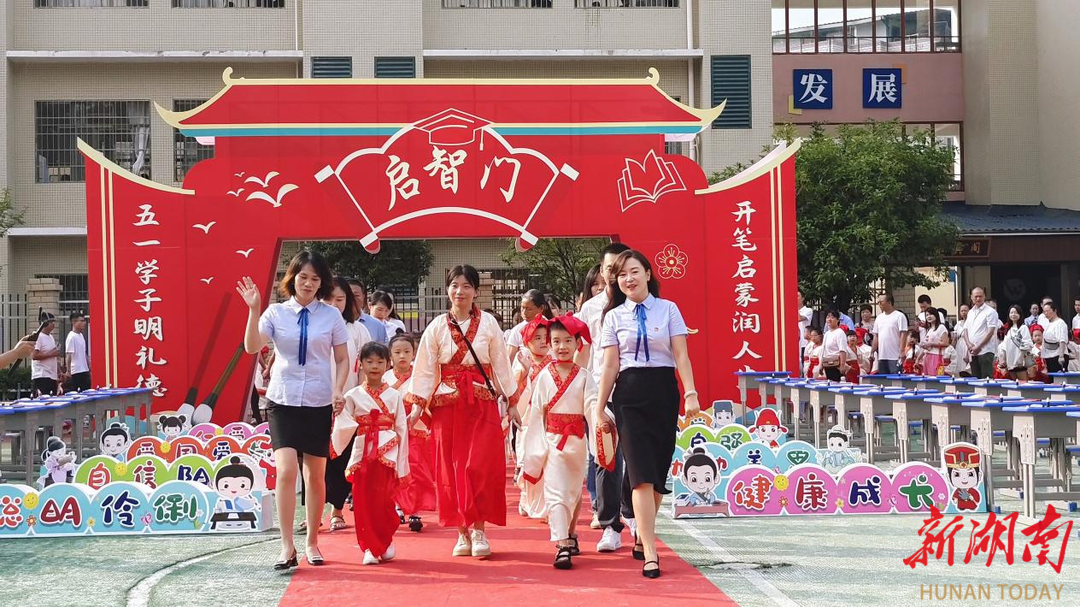 湖南日报·新湖南客户端9月28日讯(通讯员 胡诗丽)9月27日,衡阳市石鼓区五一路小学举行“启蒙开笔 礼润人生——纪念孔子诞辰2575周年暨一年级新生开笔礼”活动。孩子们身着汉服,在老师的带领下,精神抖擞地跨过“启智门”,象征着开启智慧之门,踏上充满希望与挑战的学习之旅。