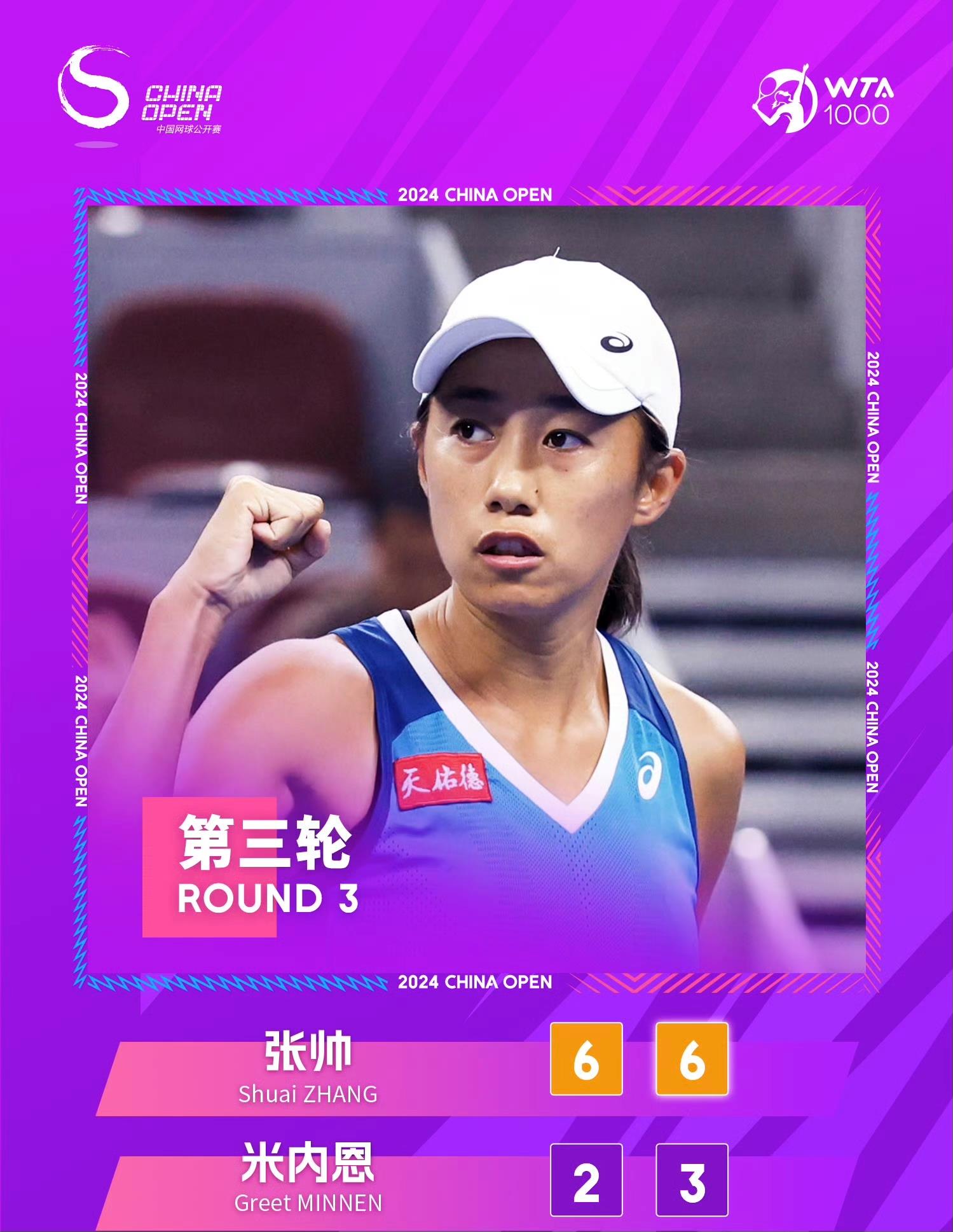 9月29日,在中网女单第三轮比赛中,35岁的张帅对阵米内恩,并最终以6-2/6-3直落两盘,成功击败对手,晋级女单16强。