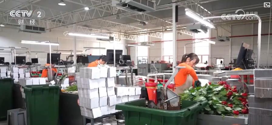 在山东莒县招贤镇的一家园艺企业包装车间,工人们正在整理打包,一束束承载着喜庆与祥和的鲜花即将从这里奔向全国各地。