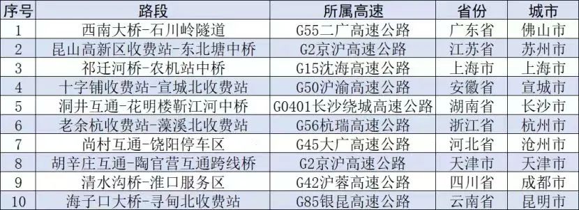 假期期间,全国高速公路出程、返程预计易发生拥堵缓行的路段,如下表所示。