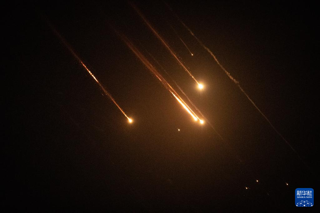10月1日,以军防空系统拦截的发射物从耶路撒冷上空飞过。新华社记者陈君清摄