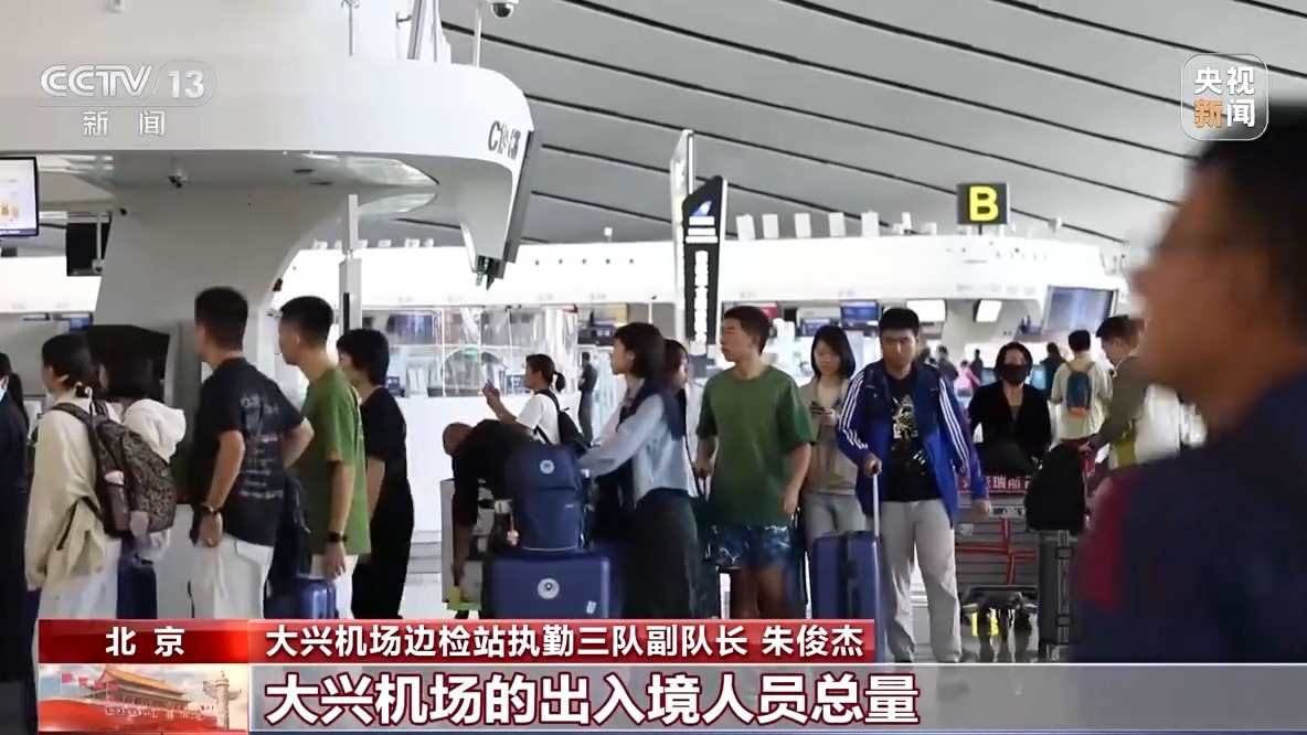 大兴机场边检站执勤三队副队长 朱俊杰:当前每天出入境的旅客量是在1.5万人次左右,根据预测从10月1日到10月7日,大兴机场的出入境人员总量将会超过10万人次,比去年同期增长超过了60%。