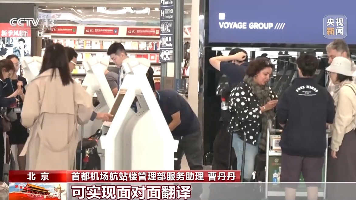 首都机场航站楼管理部服务助理 曹丹丹:结合节假日出入境旅游活跃,外籍旅客增多的特点,我们在指定问询柜台配置了翻译机,可实现面对面翻译、拍照翻译等多种语言功能,可基本满足小语种旅客群体的沟通需求。