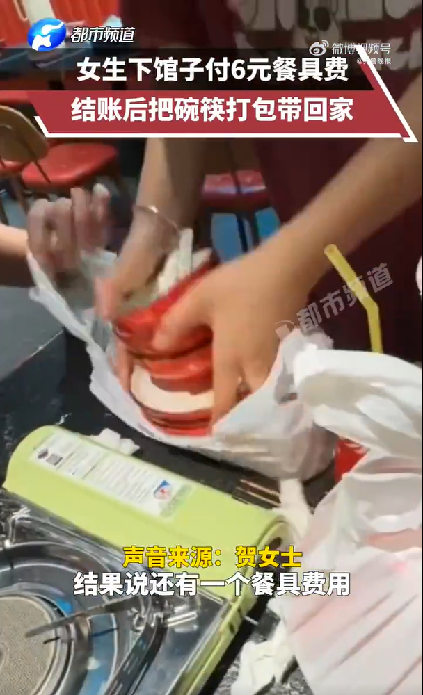 近日,浙江杭州,女生下馆子结账后发现有6元“餐具费”,遂问服务员是否可以带走,得到服务员肯定回答后,女子把碗筷打包带回家。关于“餐具费”,再次引发了广泛热议。