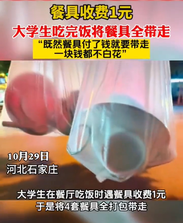 2023年10月,河北石家庄,大学生小张和同伴在餐厅吃饭,餐厅要收餐具费,每套1元,于是小张等人在结账后将4套餐具全都打包带走。小张表示,结账的时候询问过店员餐具是否可以带走,店员说可以。既然餐具付了钱,就得“一块钱都不白花”。