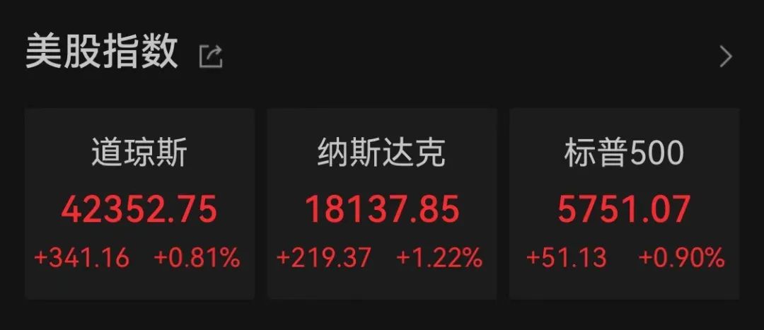 道指涨341.16点,涨幅为0.81%,报42352.75点;纳指涨219.37点,涨幅为1.22%,报18137.85点;标普500指数涨51.13点,涨幅为0.90%,报5751.07点。