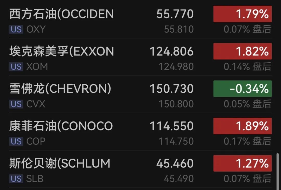 能源股多数上涨,埃克森美孚、康菲石油、西方石油涨近2%,斯伦贝谢涨超1%,雪佛龙跌幅不足1%。