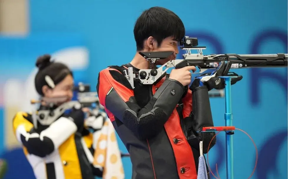 2024年7月27日,黄雨婷/盛李豪(右)在巴黎奥运会10米气步枪混合团体比赛中夺冠,赢得巴黎奥运会首枚金牌。新华社记者鞠焕宗摄