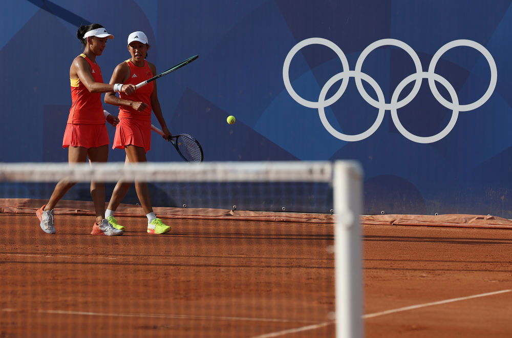 7月29日,张帅(右)/袁悦在比赛中。当日,在巴黎奥运会网球女双第一轮比赛中,中国组合张帅/袁悦0:2不敌巴西组合斯特凡尼/哈达德·马娅,止步首轮。新华社记者 高静 摄