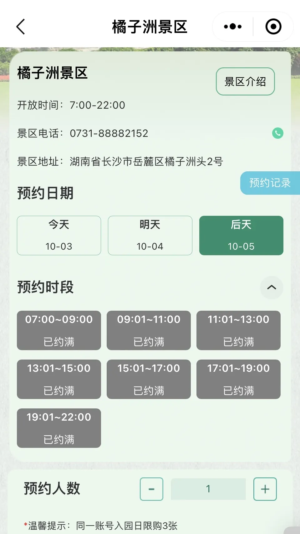 国庆期间,橘子洲景区实行非预约不入园,基本每天早上的可预约余票都为“0”。