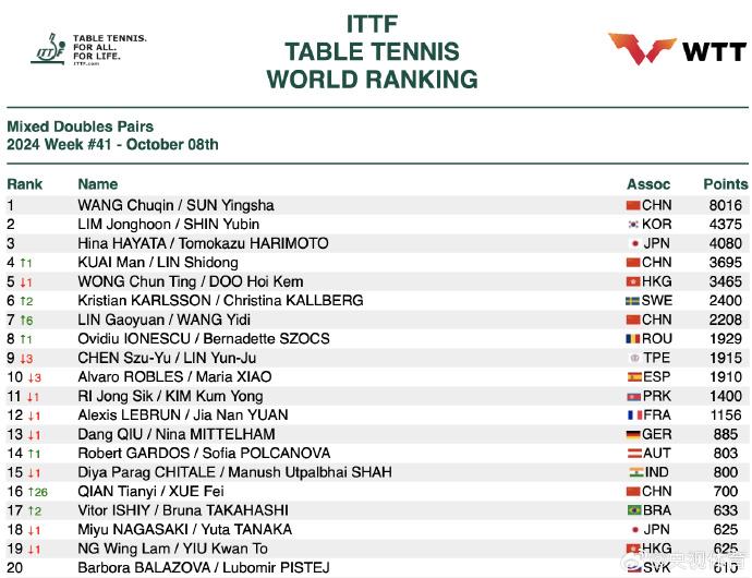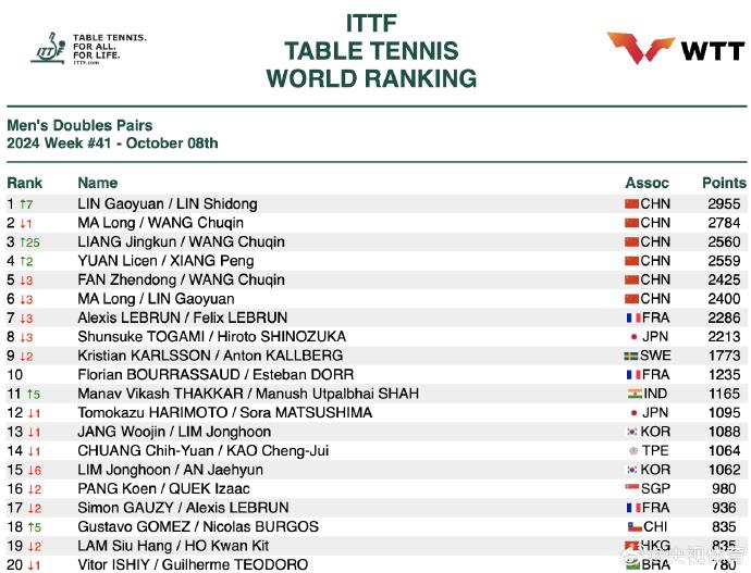 林诗栋与林高远的男双组合虽然在中国大满贯赛男双决赛中负于王楚钦/梁靖崑取得亚军,但凭借积分积累,排名上升至世界第一。