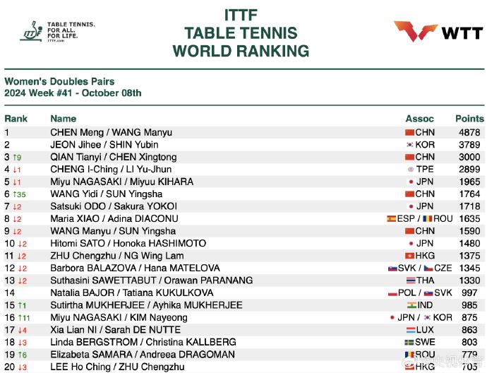 国际乒联最新排名公布!孙颖莎积分破万👏
