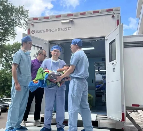 (中国医学科学院阜外医院潘湘斌教授率领团队在移动手术车上救治老挝患儿)