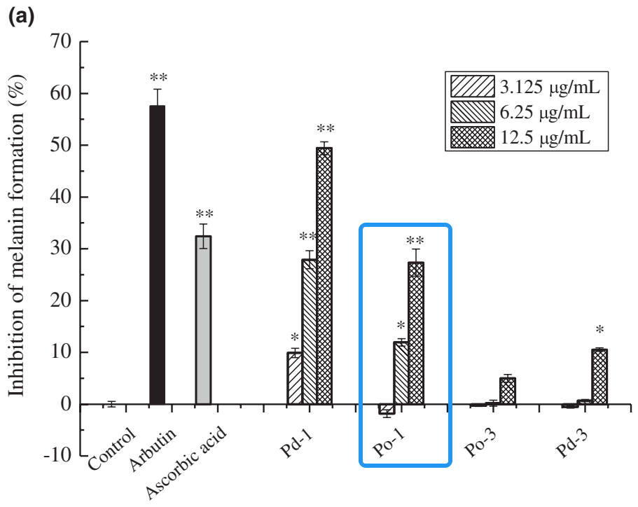 结果表明,鞣花酸和安石榴苷在不同浓度下均能显著降低黑色素的生成,其效果优于传统美白成分熊果苷。