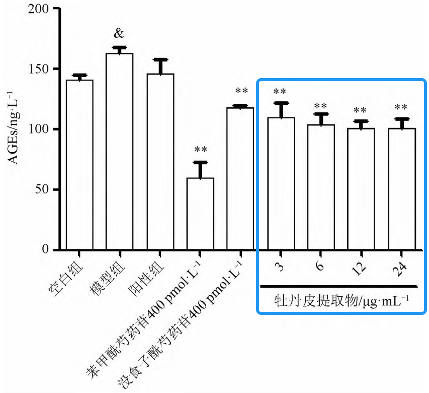 研究显示,经牡丹皮提取物作用后,细胞内AGEs的含量显著性下降,即提取物在一定程度上抑制了AGEs的生成,从而发挥抗糖化功效。