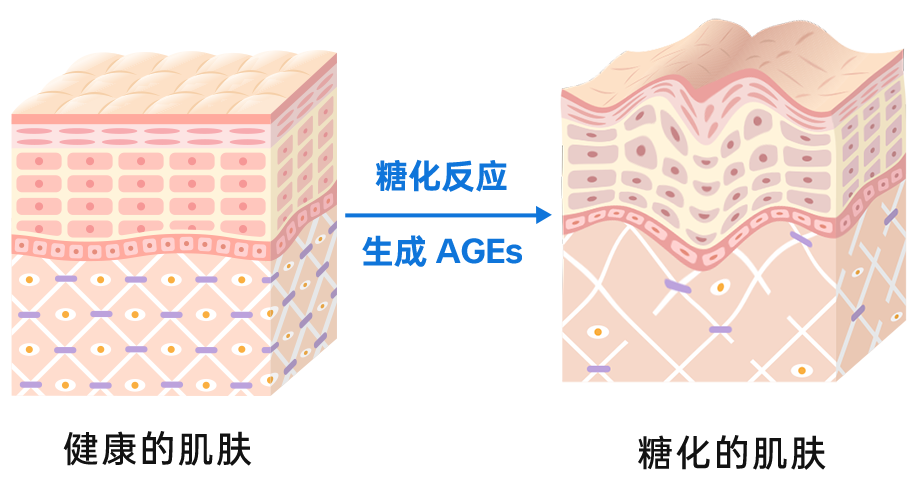 晚期糖基化终末产物(AGEs)会带来肤色暗沉、弹性下降等皮肤问题。