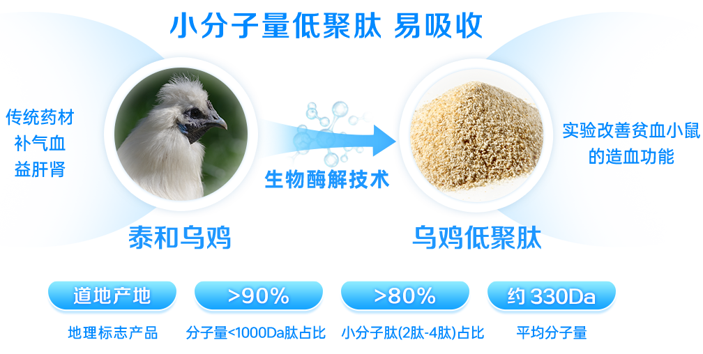 完美精选来自地理标志性产品的“泰和乌鸡”,应用酶解技术制得小分子量乌鸡低聚肽,其中2肽-4肽占比80%+。