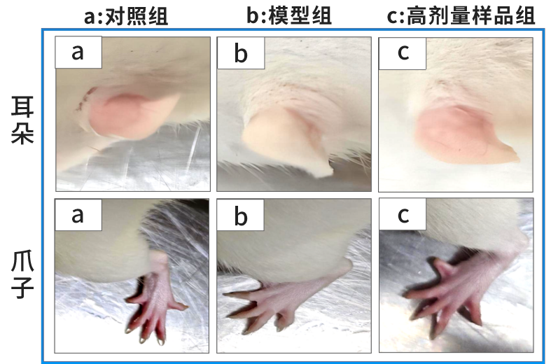 相比模型组,样品组大鼠耳朵、爪子颜色红润有光泽,且效果随剂量增加而提升。