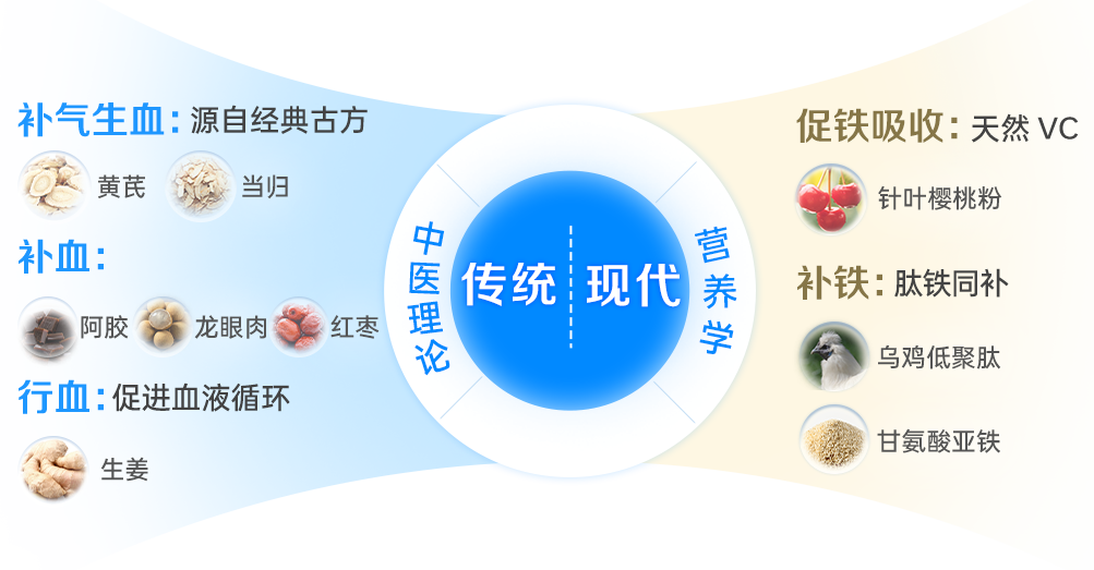 气血与我们的生活水平息息相关,完美将传统中医与现代营养学相结合,通过中医组方从源头上补气生血,辅以现代原料提升生血、补血效果及铁元素的吸收率,从多个维度改善气血不足。