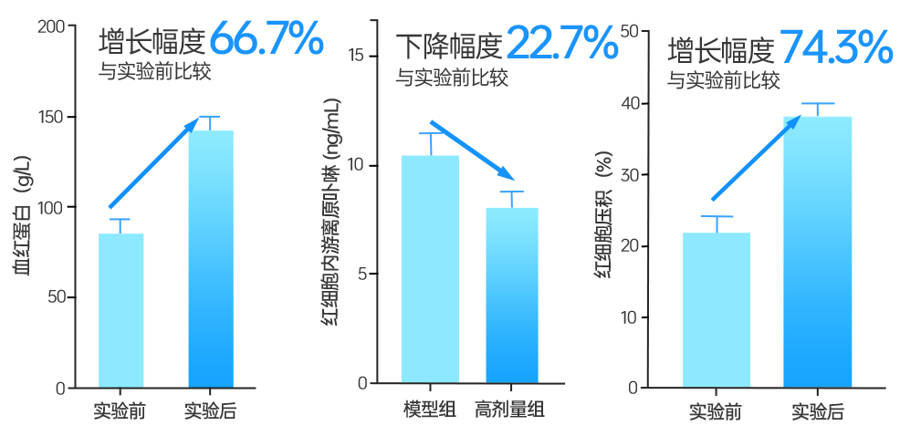 实验结果显示:相比模型组,样品组大鼠的血红蛋白(HGB)、红细胞数(RBC)、血细胞比容(HCT)得到显著提高,游离原卟啉(FEP)显著降低,有效改善了大鼠血红蛋白、红细胞指标水平。