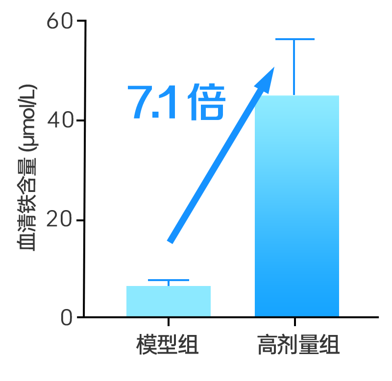实验结果显示:相比模型组,样品组的血清铁含量得到显著提高,高剂量组血清铁含量达到模型组的7.1倍。同时,样品组还降低了总铁结合力,改善铁代谢。