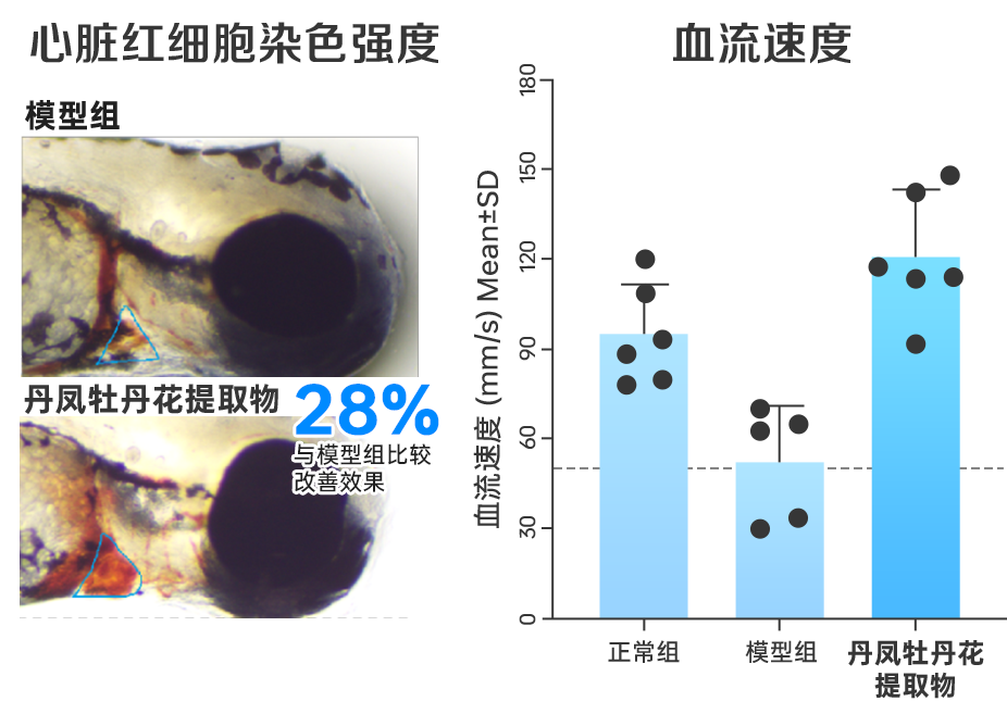 完美实验室应用斑马鱼微循环模型测试发现,丹凤牡丹花可以改善斑马鱼心脏红细胞染色强度和血流速度,有助于改善微循环。