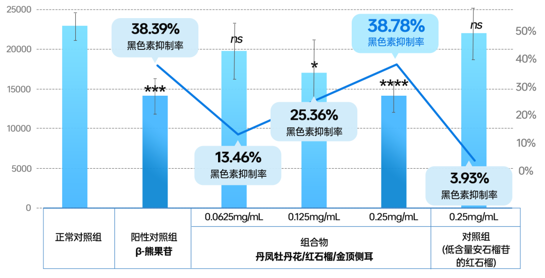 实验发现:该组合物具有明显的抑黑功效,黑色素抑制率达38.78%。