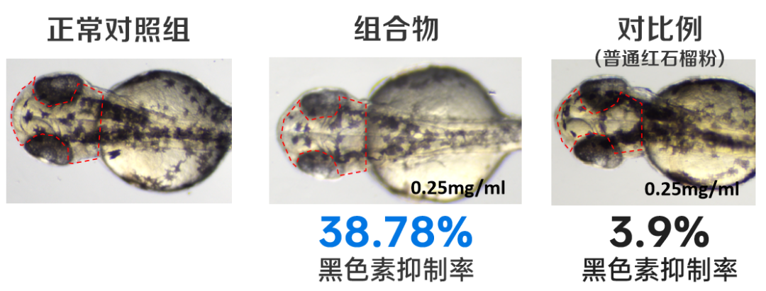 完美实验室通过斑马鱼模型对不同活性成分的红石榴进行比对,实验结果证明:优选地红石榴抑制斑马鱼黑色素的效果更佳。