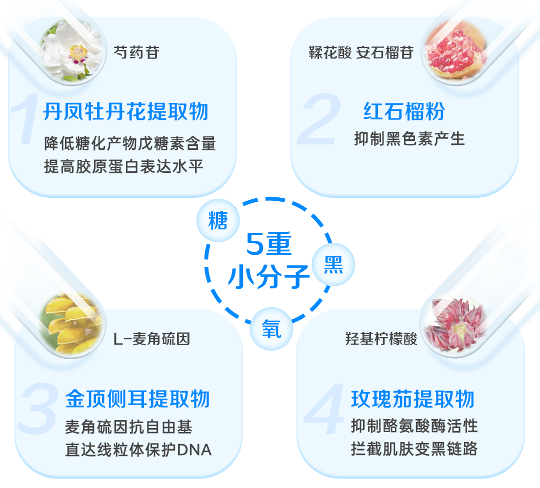 完美红石榴牡丹花组合物,针对从抗糖、抗氧、抑黑到改善微循环的方方面面,以科学的配方设计和功效与安全验证,为我们提供有效的解决方案,多方位呵护你的肌肤健康,由内而外让肌肤绽放自然之美。